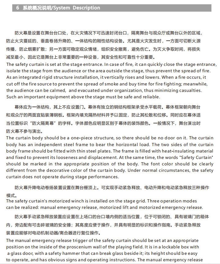 厅或舞台以外的区域,起到防止火灾蔓延的作用。防火幕幕体为刚性结构,是通过卷扬方式垂直升降的设备。